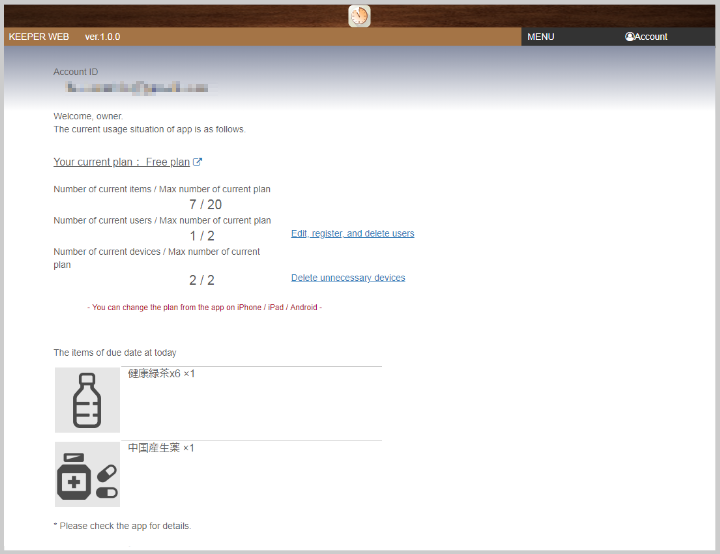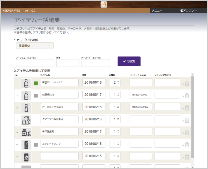 You can check the item status of each category from the browser, update the item name, due-date, stock number, bar code (JAN), memo.